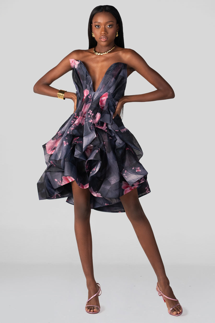 MIDNIGHT BLOSSOM RUFFLED DRESS
