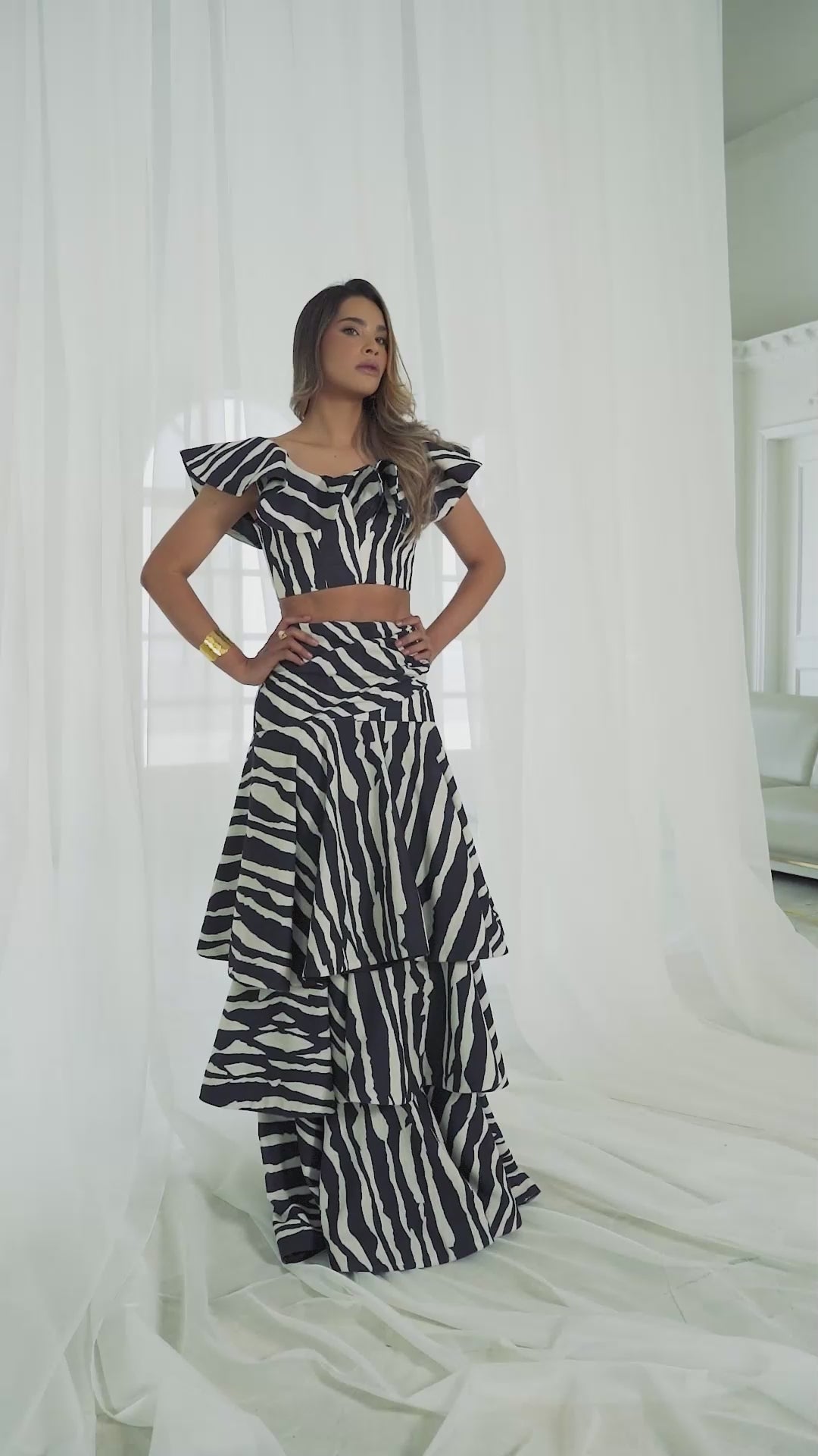 A bold harmony of structure and rhythm. The MIDNIGHT STRIPE SKIRT ENSEMBLE captures the free spirit of the sea after dusk, combining a sculptural crop top with a tiered, flowing maxi skirt. Crafted in a lightweight linen-blend fabric, its black-and-ivory stripes evoke natural elegance with an edge of modern allure. Perfect for sunset gatherings or moonlit soirées.