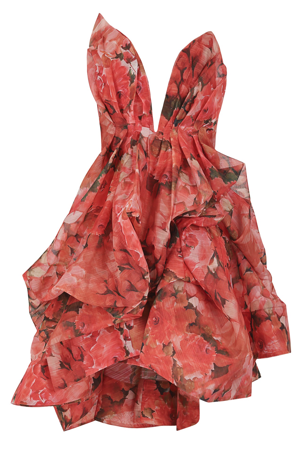 Like a blooming flame, the CRIMSON PETAL DRESS is a celebration of movement and passion. Its sculptural silhouette and deep neckline evoke the power of nature in full bloom. Crafted in a structured floral jacquard, this piece combines drama and elegance with cascading folds that mirror the fluidity of petals in motion.