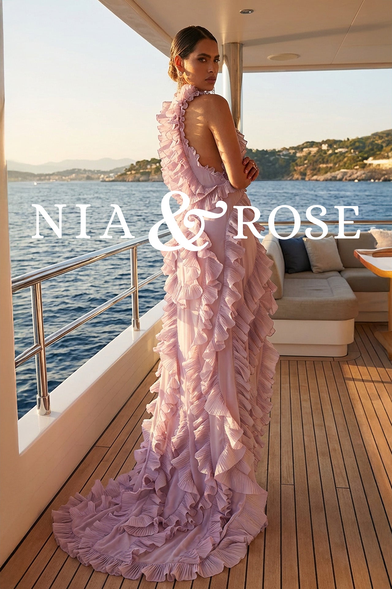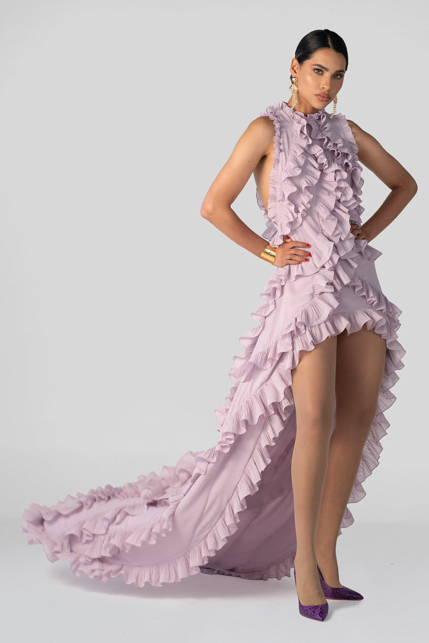 A symphony of movement and femininity. The LILAC CASCADE GOWN is crafted in soft chiffon with sculptural ruffles that flow like waves in motion. Its asymmetric high-low silhouette and open sides make it both ethereal and powerful — a celebration of bold grace.