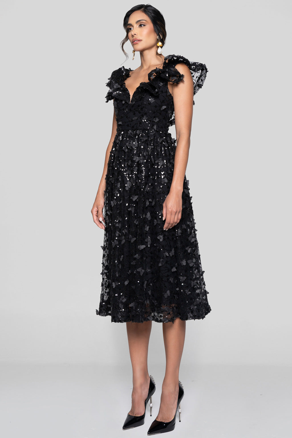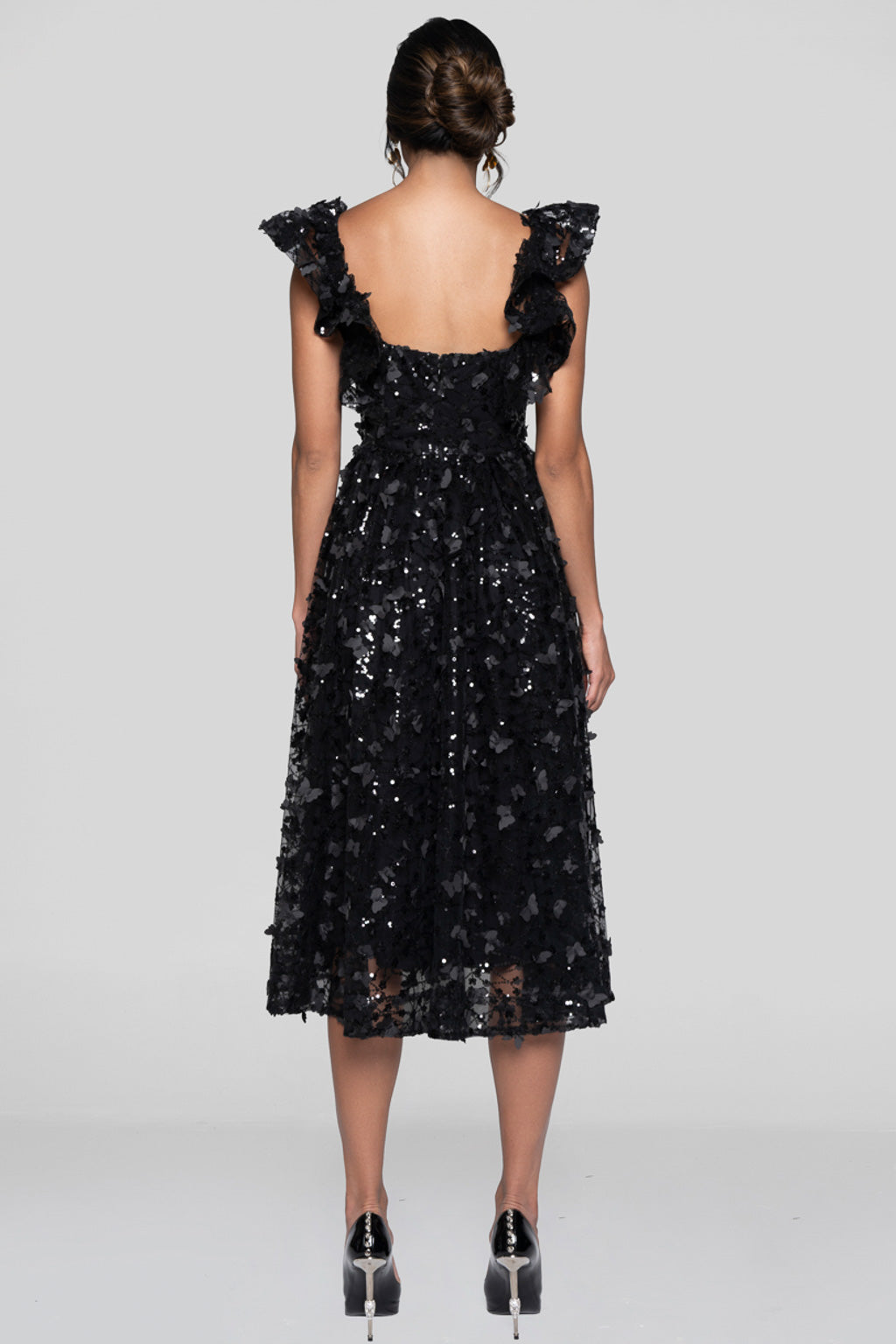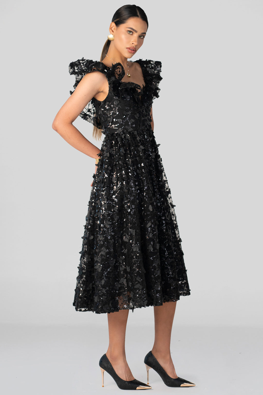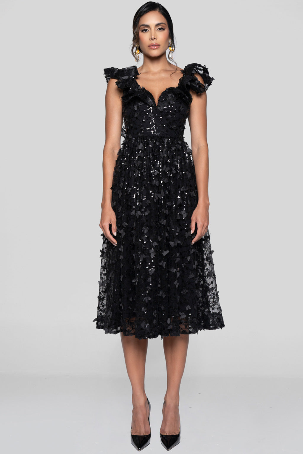 An ode to timeless elegance. The BLACK ORCHID MIDI DRESS blends romantic volume with modern luminosity. Crafted in a sheer tulle base embroidered with black sequins in organic shapes, it catches the light with every movement. The sculpted ruffles along the shoulders frame the neckline and bring a dramatic yet refined allure.