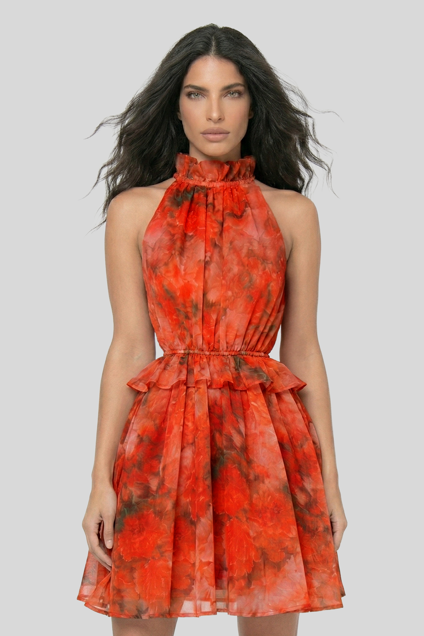 A bold expression of movement and light. The CRIMSON BLOSSOM MINI reinterprets the iconic Midnight silhouette in a fiery red floral print. Crafted in airy sheer organza, it features a high gathered neckline, soft ruffle detailing at the waist, and a voluminous layered skirt that moves like petals in the wind. Vibrant, feminine, unforgettable.