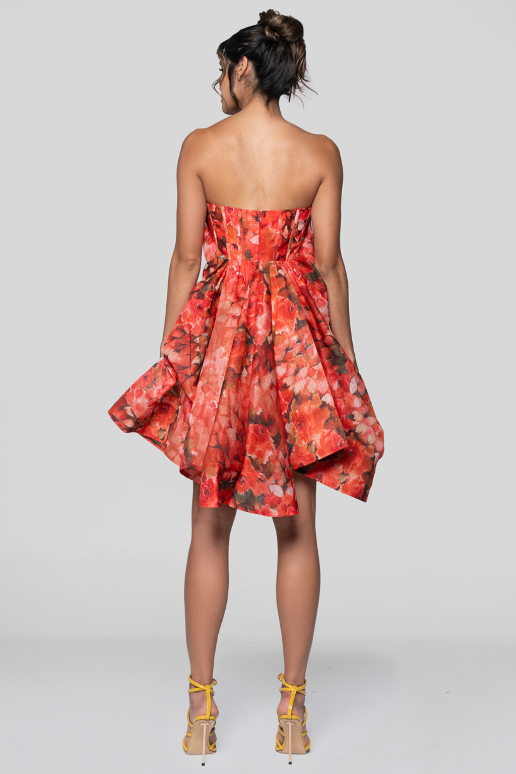 Design: strapless short dress with deep neckline and asymmetrical draped skirt.