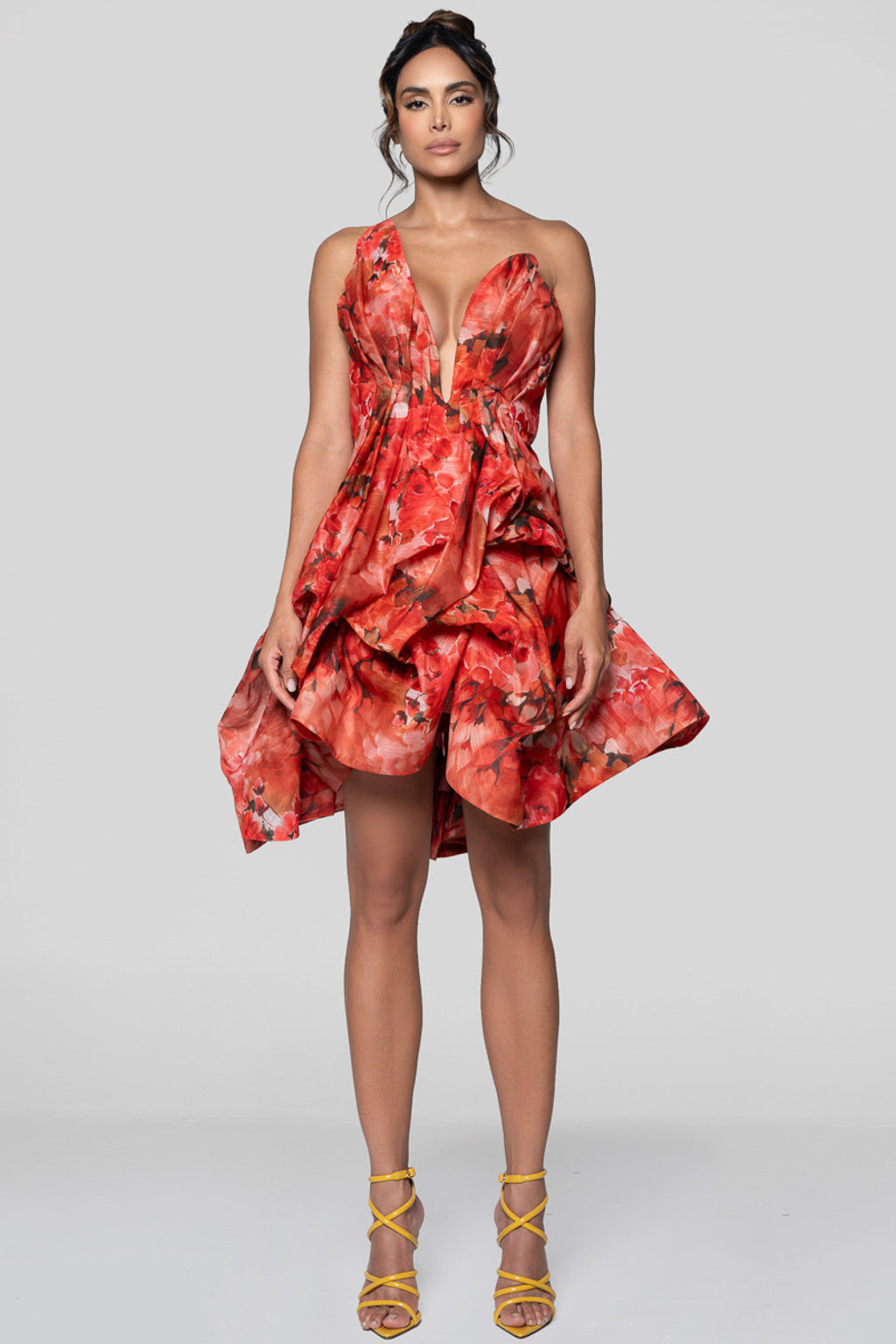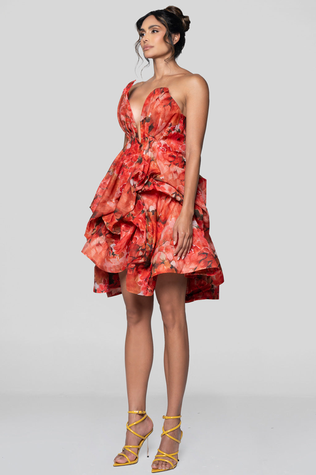 Like a blooming flame, the CRIMSON PETAL DRESS is a celebration of movement and passion. Its sculptural silhouette and deep neckline evoke the power of nature in full bloom. Crafted in a structured floral jacquard, this piece combines drama and elegance with cascading folds that mirror the fluidity of petals in motion.