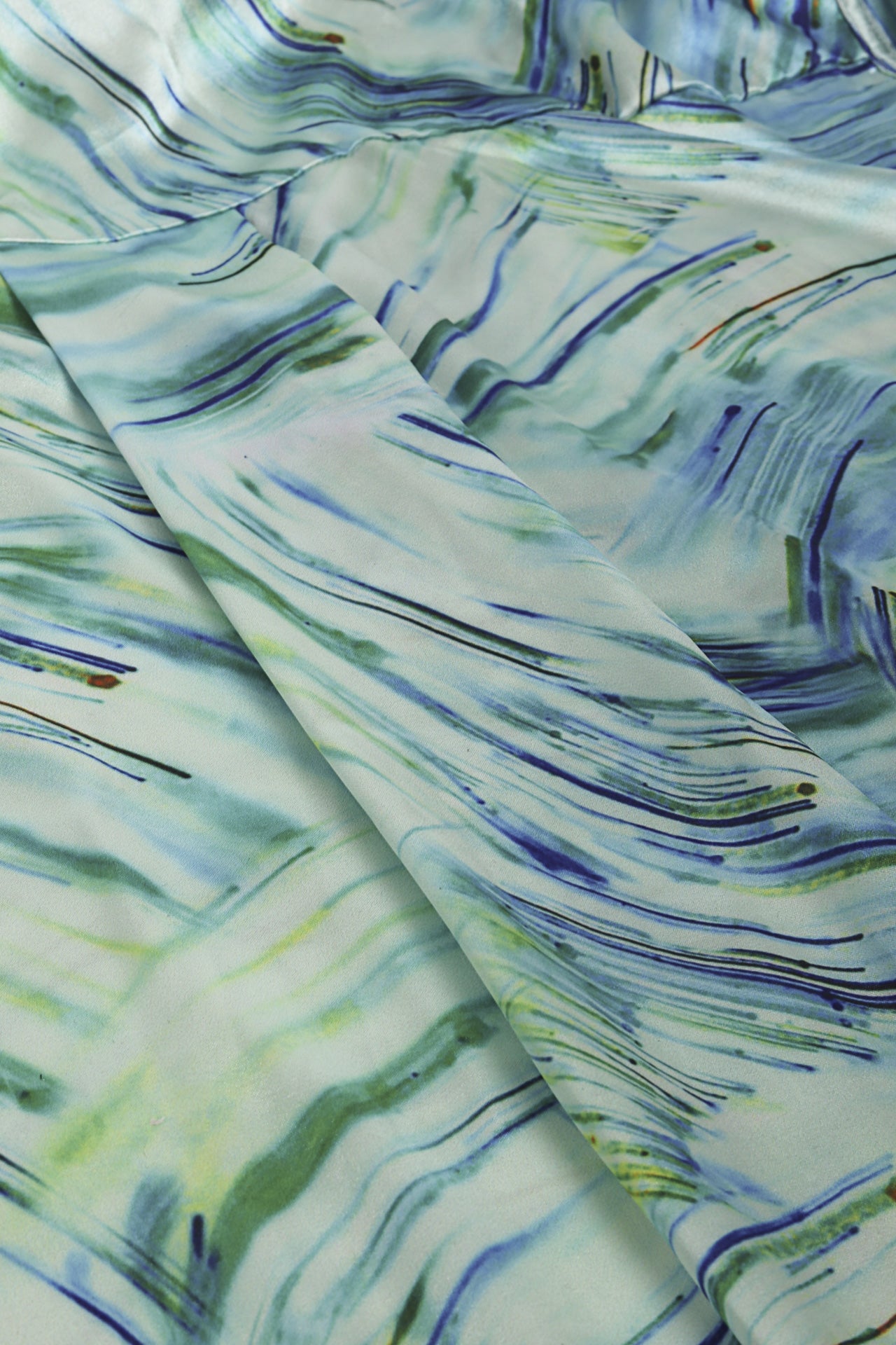A breezy two-piece ensemble featuring a collared, button-down top with relaxed sleeves and a playful, high-waisted skirt. The swirling green pattern draws inspiration from lush tropical vistas, infusing each piece with a sense of lively movement. Crafted from a premium blend of polyester, synthetic silk, and elastic, it offers both lightweight comfort and a subtly structured feel. Finished with subtle gathering at the waist and an airy silhouette, this set is designed to evoke effortless sophistication and modern allure.